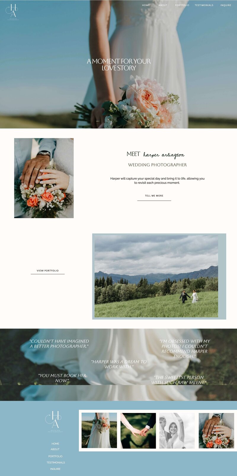 The color palette was built around deep, warm neutrals to add depth and sophistication. These tones communicate warmth and approachability while remaining elegant. Overall, the design strategy focused on blending emotional connection with visual credibility, positioning Harper Arlington as a wedding photographer who offers both artistry and expertise.